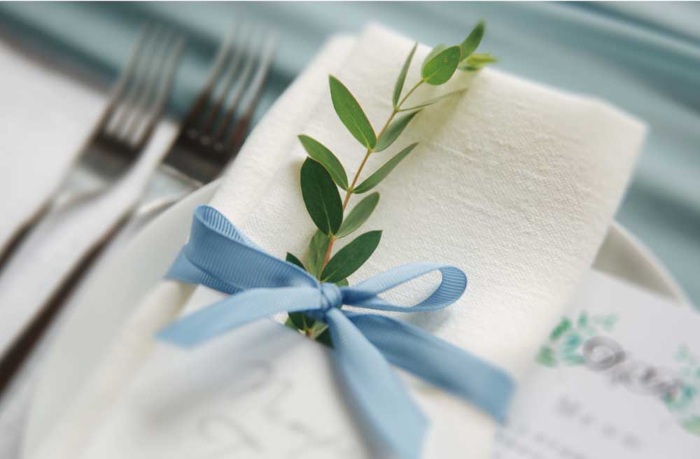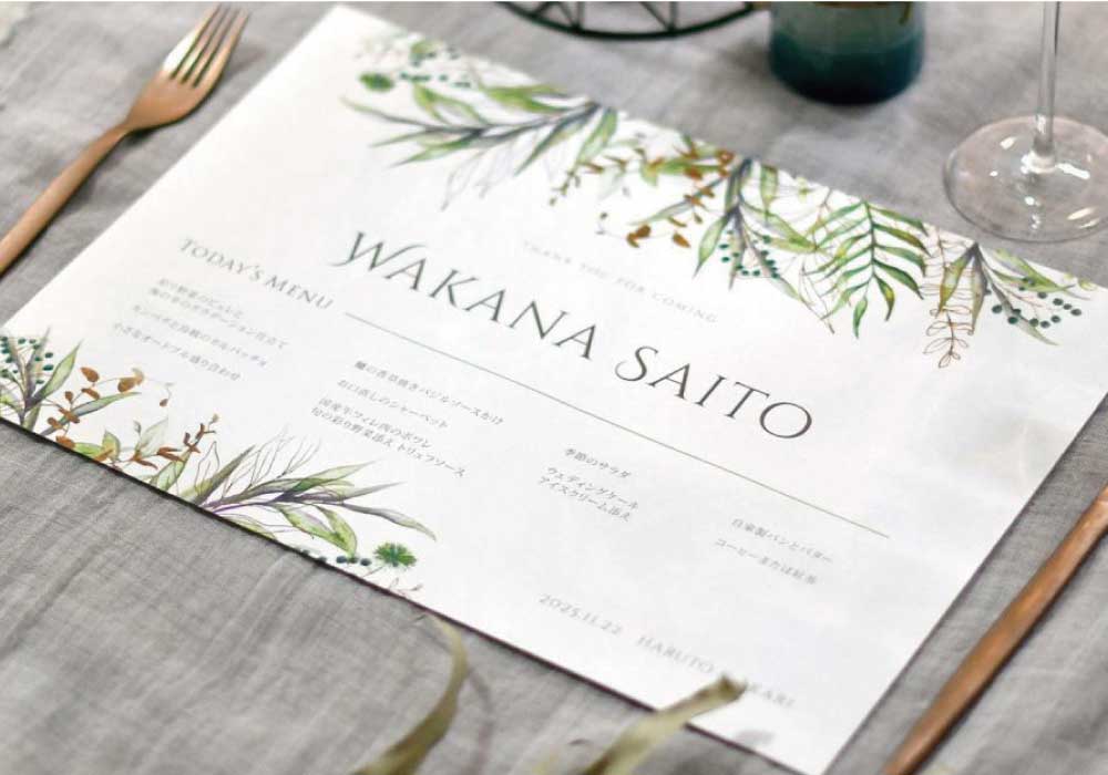 新緑のデザインがオシャレな席札付きのメニュー表は、抗菌仕様のペーパーを仕様したアイテム。コロナ禍での結婚式でできる、新郎新婦からゲストへのちょっとしたおもてなしになります。