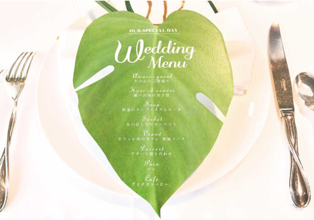 まるで本物の葉っぱのようなメニュー表はグリーンをテーマにしたテーブルコーディネートにピッタリ!ゲストが思わず驚いてしまう、ちょっとしたサプライズ演出にもなります。