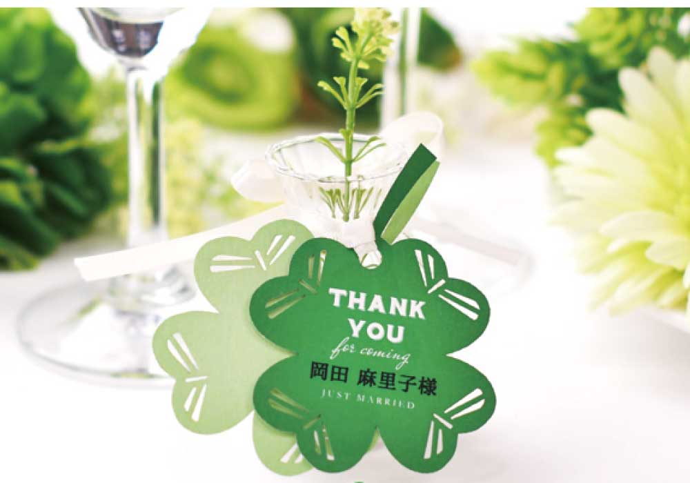 クローバーを形どったタグ風の席札なら、プチギフトを付けて席に置いておいても!コロナ禍での結婚式では、プチギフトを予め席に置いておくという対策を取る新郎新婦様も増えています。かわいいタグを付ければ、ゲストも喜んでくれるはず♡
