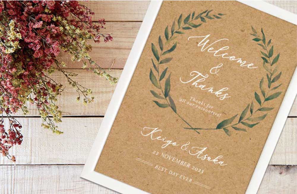 クラフト&グリーンの組み合わせも絶妙ですよね。大人ウェディングにも、カジュアルウェディングにも合うデザインです。