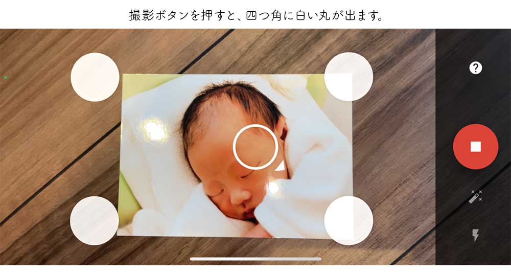 ②撮影ボタンを押すと、写真の中央に白い枠の丸がひとつ、写真の四つ角に白い丸が四つ出てきます。