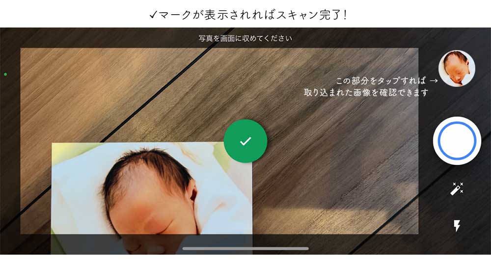 ④✓マークが出たらスキャン完了!初期設定した場所にデータ化された写真が保存されています。(私はスマホのカメラロールに保存されるようにしました!)