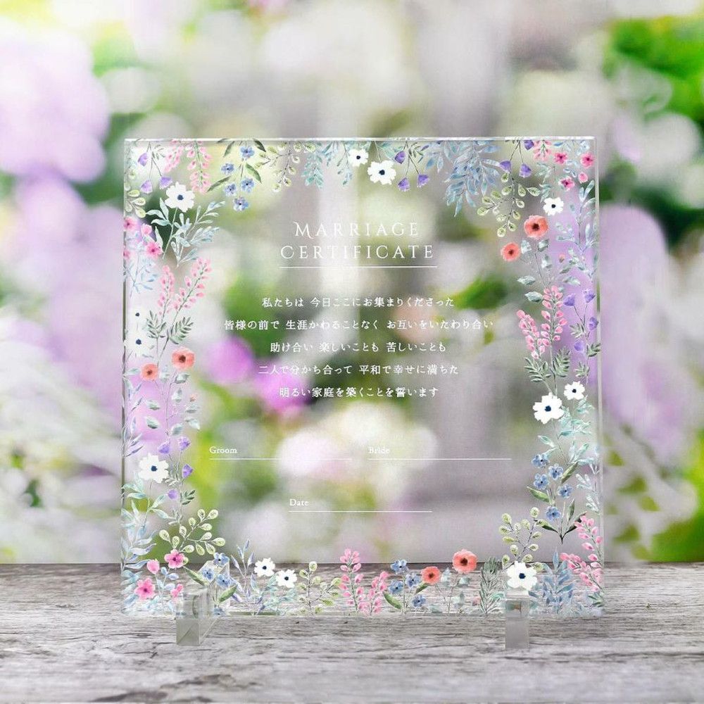 同じく花柄をプリントした結婚証明書。文章も白UV印刷だからはっきりみえ、宣言しやすい。