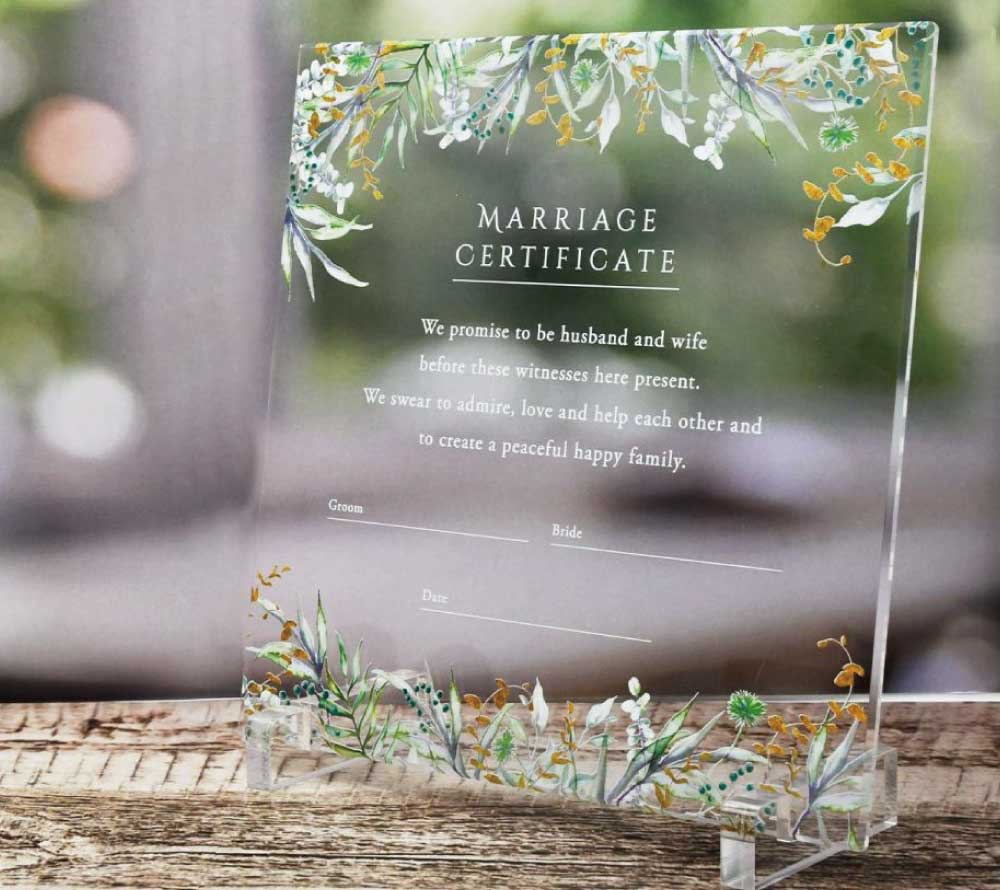 アクリルにリーフのイラストをUV印刷した結婚証明書。デザインの合間の透け感アクリルらしくおしゃれ。サインは白ペンで手書きして。