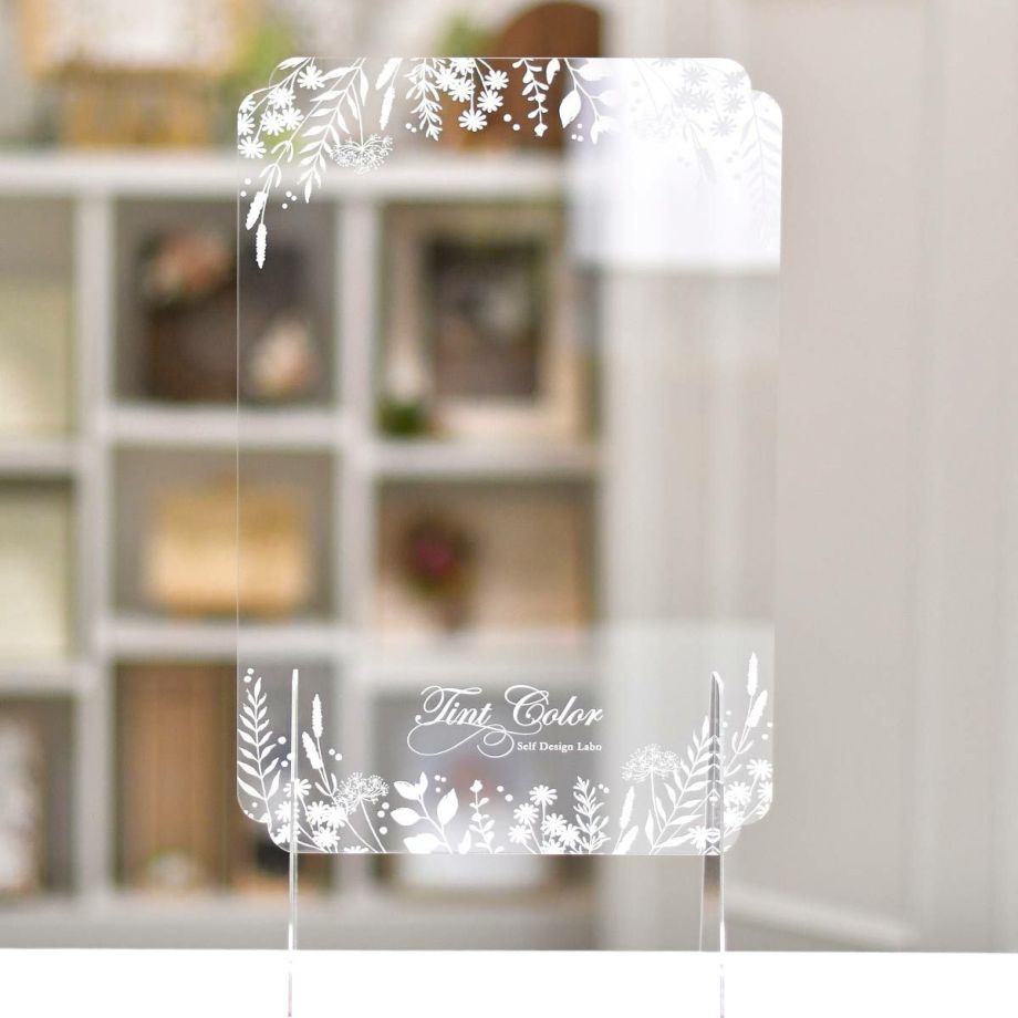 アクリル板といえば、飛沫防止受付パーテーション。結婚式なら無機質なものじゃなくデザイン性の高いものをあえて準備するのもGOOD!