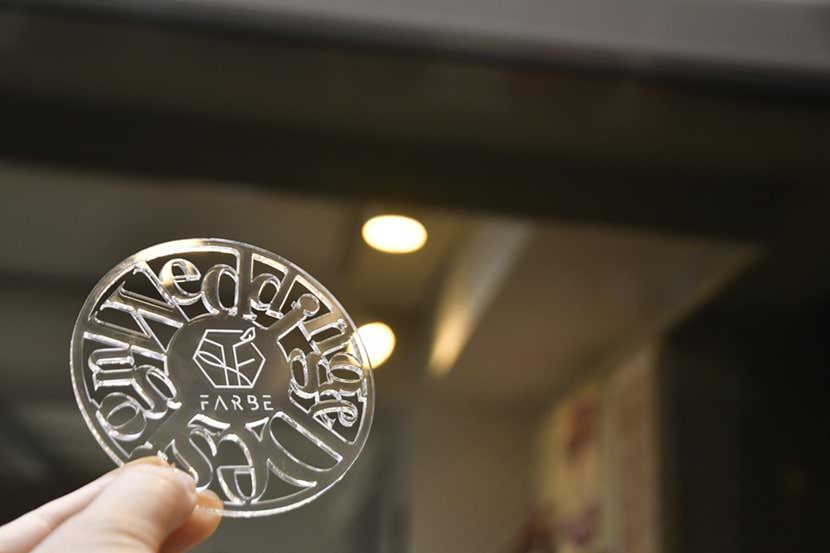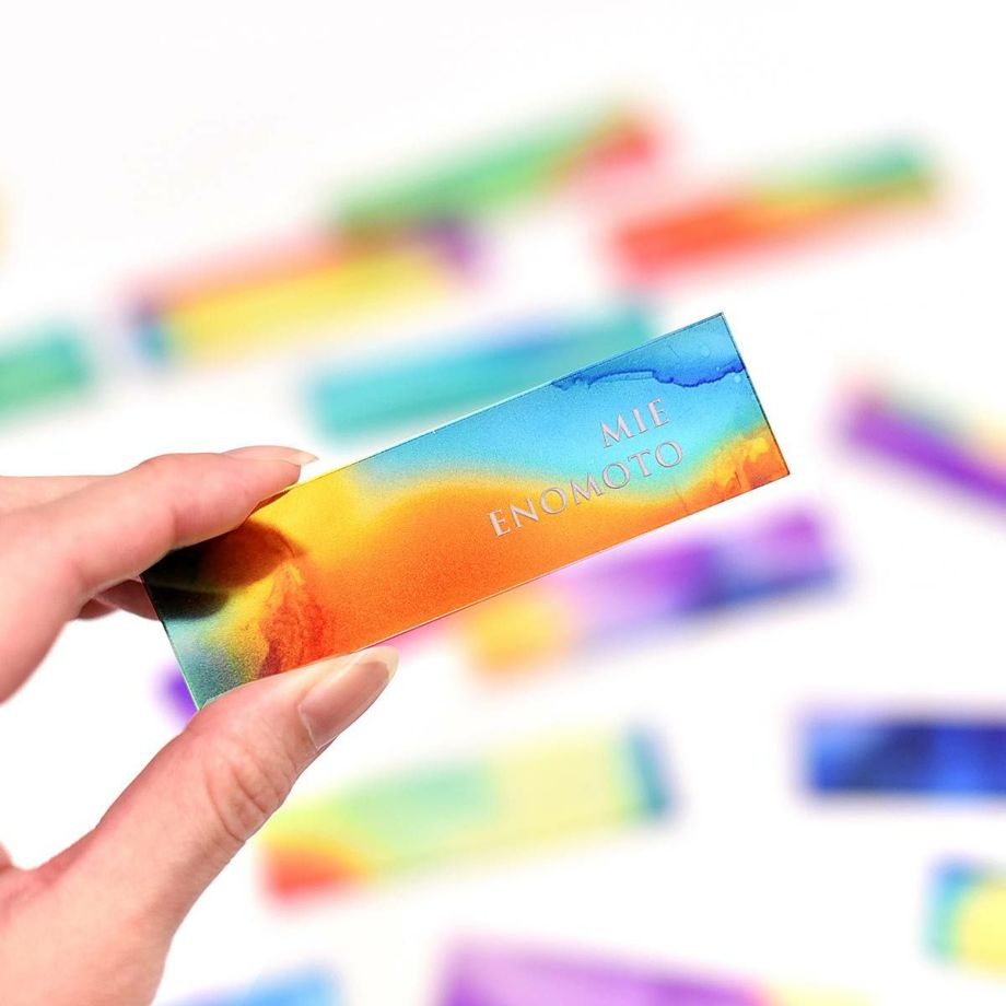 アクリルにカラフルな模様がUV印刷された席札。ゲストの名前入りだから席札として使えちゃう。