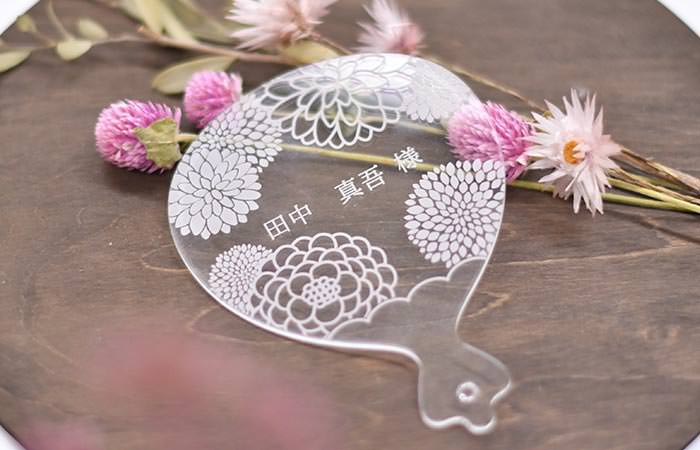 かわいい小さなアクリル素材の名入れうちわ。ちょっとしたお土産にもなりそうな、クリアだから涼しさが増す夏婚アイテムです。