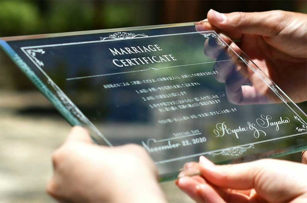 今人気のアクリルやガラスタイプの結婚証明書。透明感のあるクリアな素材もトレンド感があります。アクリルやガラスの結婚証明書は、見映えがとっても良いので、当日だけのアイテムにするにはもったいない!!チャペルでの前撮りでは、是非お二人が手にもってお写真に写ってみてください♡挙式後はもちろんインテリアとして飾っておけるから、大切な誓いの言葉をずっと大切にそばに置いておくことができますよ。