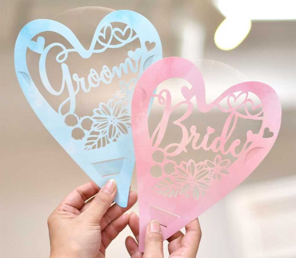 本来の用途は結婚式当日の飛沫対策用のマウスシールド。新郎新婦専用なので、「Groom」「Bride」と文字が入っているところも可愛いです♡この見映えなら前撮り用のプロップスとしても使えそうですね。フィルムの部分は取り外しできるようなので、写真撮影時は台紙だけをプロップス代わりに使用することもできそうです。