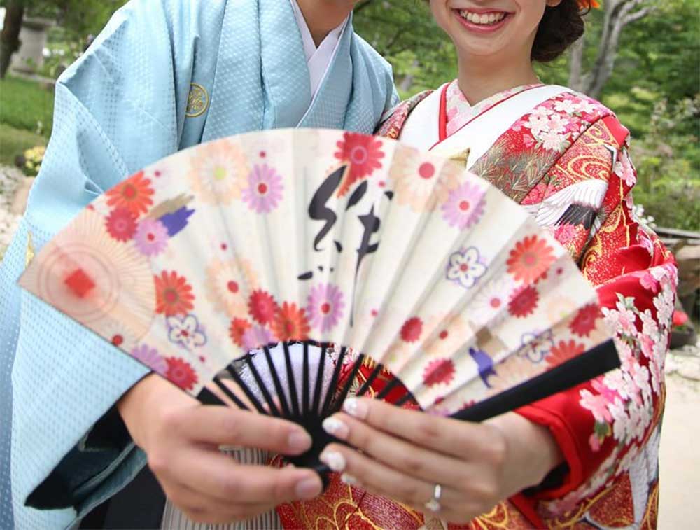 当日はドレスだけという方も、前撮りでは和装をする方が結構多いですよね。和装用にガーランドなどの撮影小物を準備される方も多いのですが、どんなものがいいか迷っている方はこちらの扇子型の結婚証明書もオススメです。裏面には誓いの言葉が記されています。素敵な前撮り写真が撮影できること間違いなしですね!