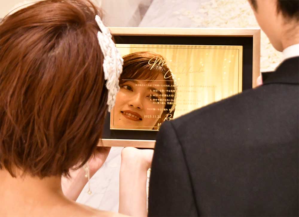高級感と重厚感を兼ね備えたアクリルミラータイプの結婚証明書もオススメ。ミラータイプなので、お二人のお顔がミラーに映り込むから、そのお写真を撮ってもらうのも素敵。当日はなかなか細かい指定をするのは難しいから、こちらも前撮りでカメラマンさんにオーダーして撮影してもらうのがオススメです♡