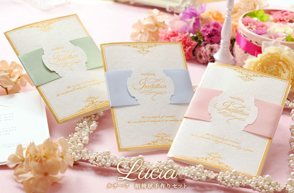 ピンク、ブルー、グリーンのマカロンカラーのリボンがかわいい招待状「ルチーア」。ホワイトのペーパーにゴールドのデザインで、上品かつラグジュアリーに仕上がっています。招待状を受け取った女性ゲストが、思わずうっとりしちゃう招待状ですね。