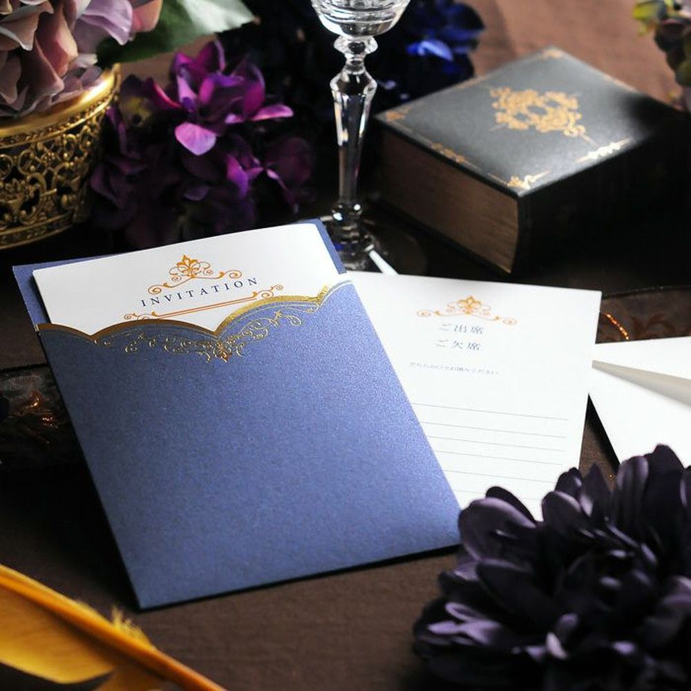 ネイビーとゴールドでエレガントさが光る招待状「ディーナ」。大人婚やシックにキメたい2人にぴったりな招待状です。本状は半分に折って、台紙の中に入れるスタイル。本状とハガキには同じようにゴールドの飾りがあしらわれているので、統一感がある印象になっています。