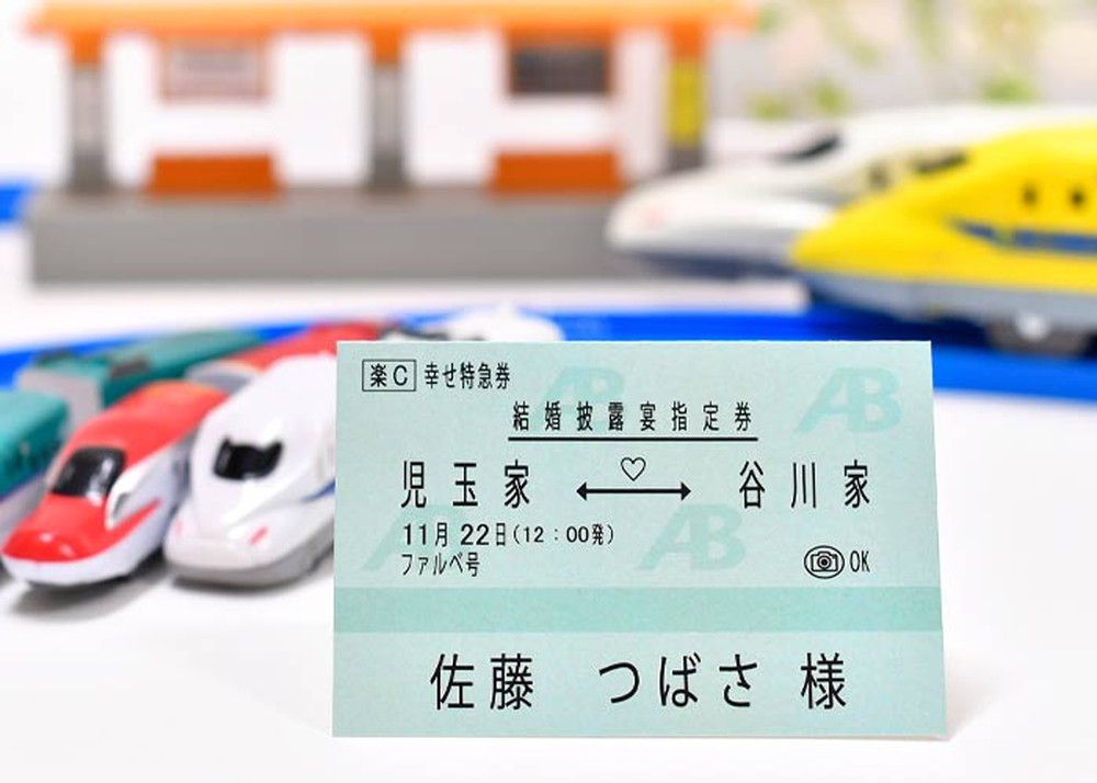 ゲストの記憶に残るユニークな席札にしたいなら、切符デザインはいかがでしょう?もちろん電車好きのカップルにもおすすめです。こちらの席札デザイン、JRの本物の切符にそっくりで、しかもよく見ると、上の駅名が両家の名字になっているという手の込みよう。これは、手作りではちょっとマネできないかも。