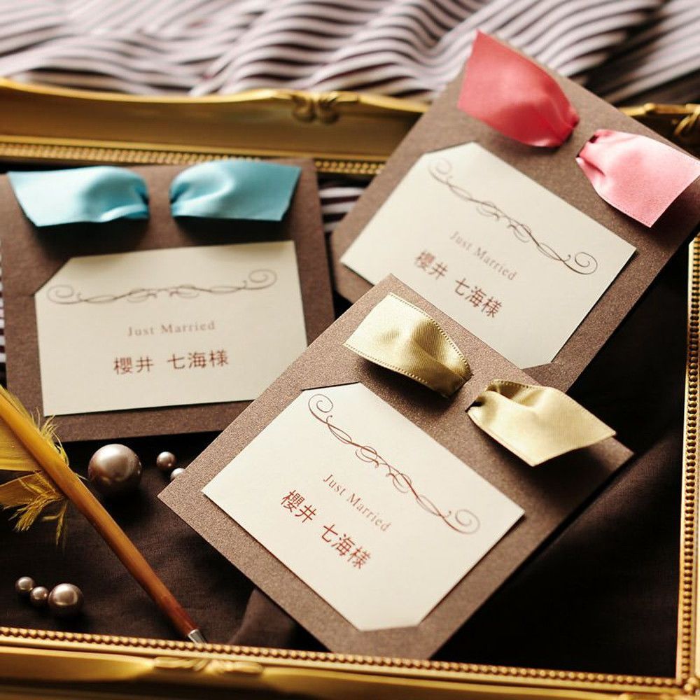 会場全体をシックな雰囲気でまとめたいカップルにおすすめなのが、シンプルデザインの席札。落ち着いた茶色の台紙にサテンのリボンがよく映えて、とても上品な印象です。手作りキットでは台紙にすでにリボンがセットされているので、あとはゲストの名前を印字した用紙を挟めば完成!