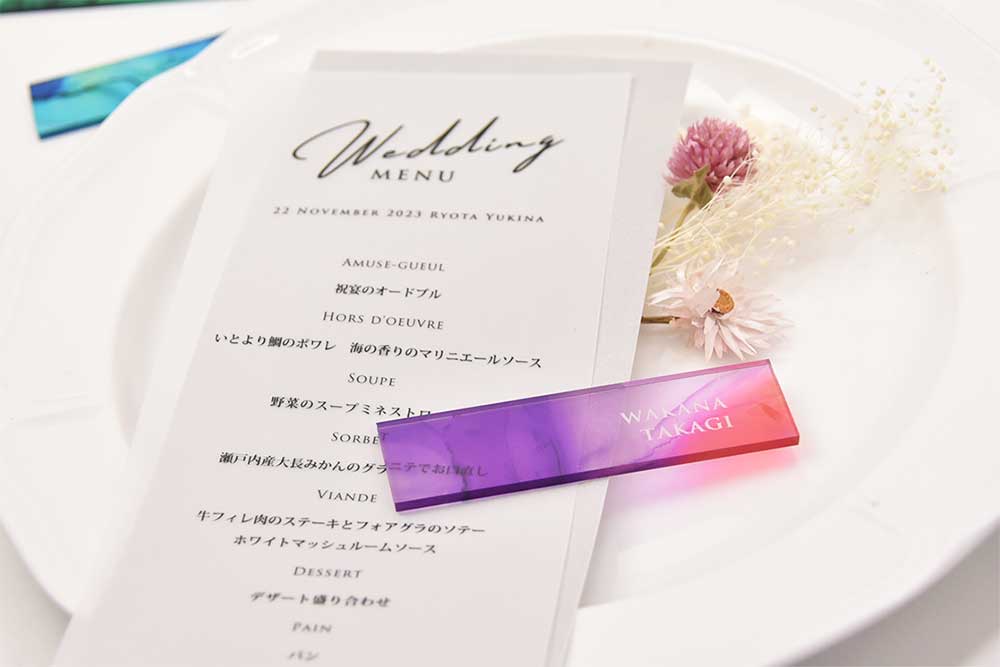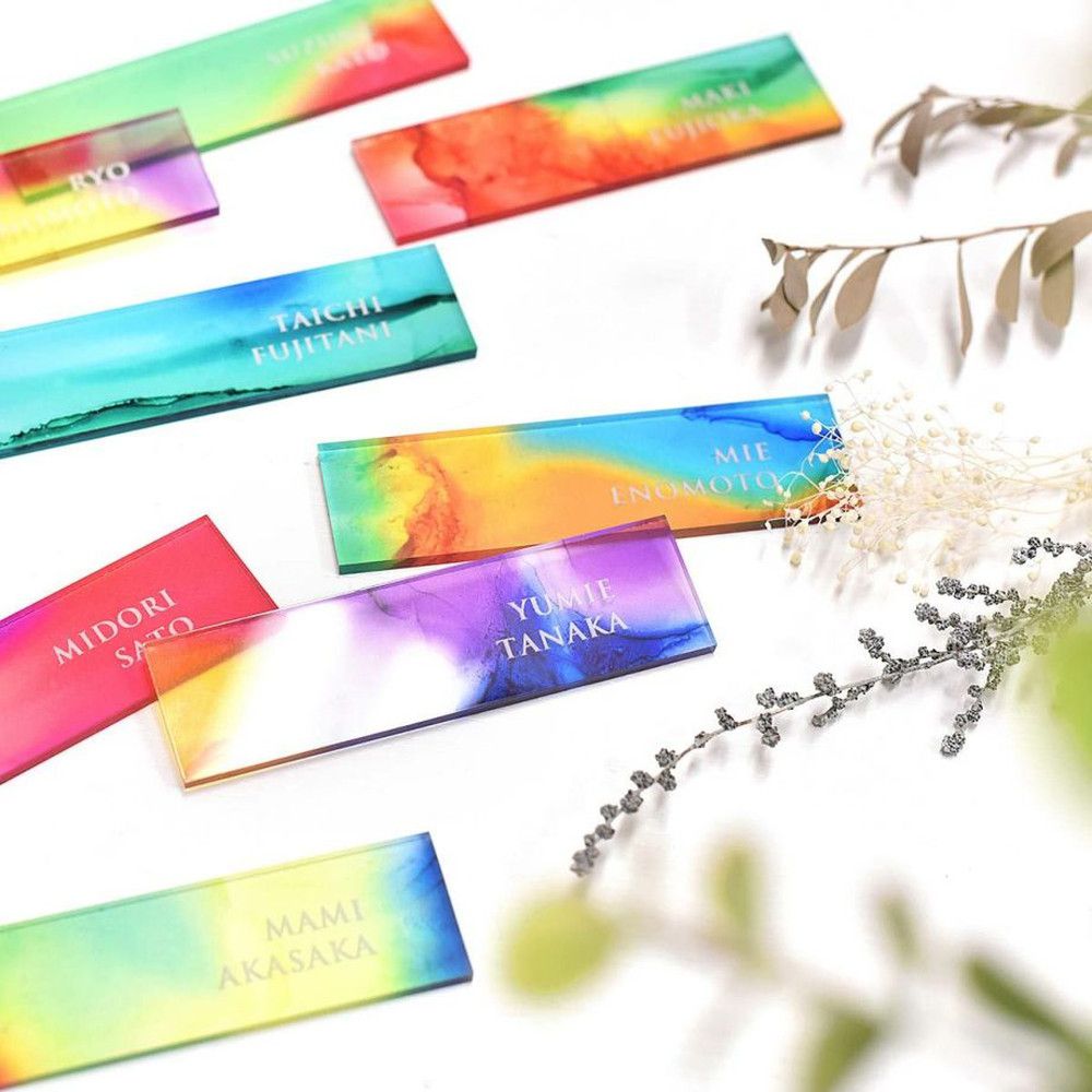 同じくクリアなデザインで、アクリルアートを利用したちょっと変わった席札も。アクリルに半透明のマーブル模様がプリントされたデザインは、存在感があります。オプションでプレートの端に穴をあけてもらえるので、チェーンなどを通して、名前入りのキーホルダーやチャームとしてゲストに末永く使ってもらうことも可能です。