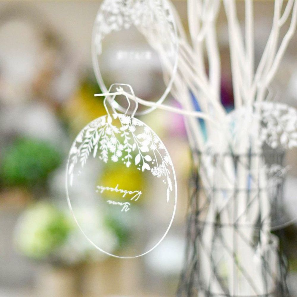 結婚式専用のフェイスシールドに、ゲストひとりひとりの名前を印刷すれば、席次表としても活用することができます。デザイン性のあるフェイスシールドをテーブルに置いておくだけで、グッとおしゃれな雰囲気がアップしますよ。