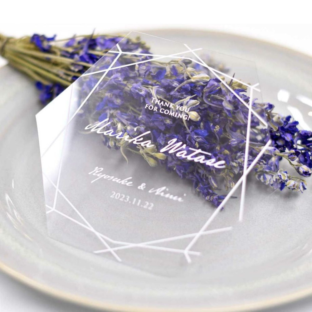 6角形のシルエットが目を引くこちらのフェイスシールドは、席札としても使える便利なアイテムです。お皿の上に乗せることで、ゲストが座る席を明確にし、テーブルコーディネートもグッとおしゃれにしてくれます。お花がさりげなく描かれているので、テーブルに配置された花束とデザインをリンクさせるのもおすすめです。
