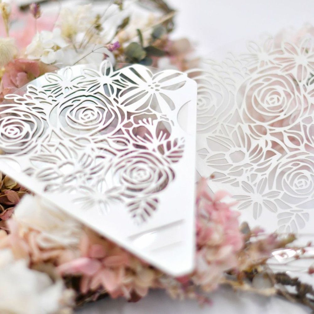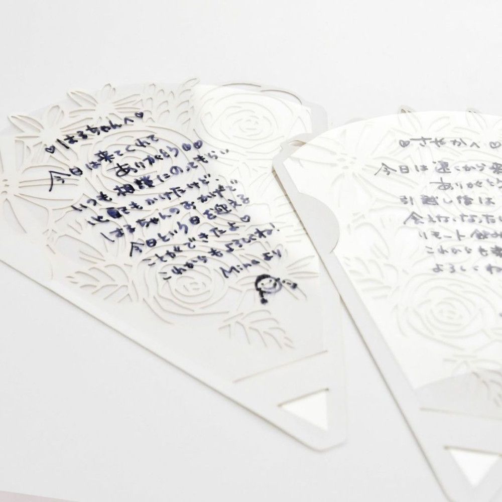 結婚式の上品でラグジュアリーな雰囲気にぴったりなのがこの「花束」。バラのような花をモチーフにしており、繊細な花びらのカットに目を奪われます♡三角のシルエットは、握りやすく口元をしっかりカバーしてくれるので、機能性も◎まるで花束で結婚式をお祝いしているかのような幸せな雰囲気づくりにも一役買ってくれるアイテムです。