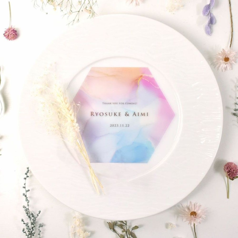こちらの「ペール」は、虹色の色合いがかわいいアイテムです♡ゲストの名前や結婚式の日付を記載して席次表との兼用アイテムにすれば、シンプルなお皿もおしゃれに早変わりします。テーブルコーディネートになんだか物足りなさを感じる場合に取り入れるのも◎