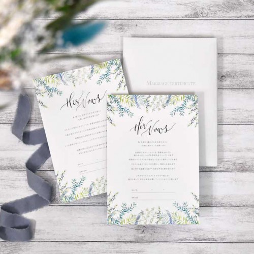 お互いに誓いの言葉を考えて、ぞれぞれサインするスタイルの結婚証明書も。それをひとつの台紙に入れて保管しておけます。