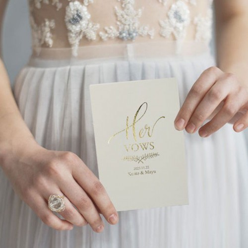 こちらは、お互いに誓いの言葉を手書きで、お手紙のようにしたためるスタイルのVowBookです。このタイプなら、「当日まで内容は秘密♡」にすることもできるので、ちょっとしたサプライズ要素もあり、お互いの言葉に感動もひとしおかも。お互いに誓いの言葉を読み合うスタイルは、家族婚や少人数婚の演出として取り入れる方も増えています。