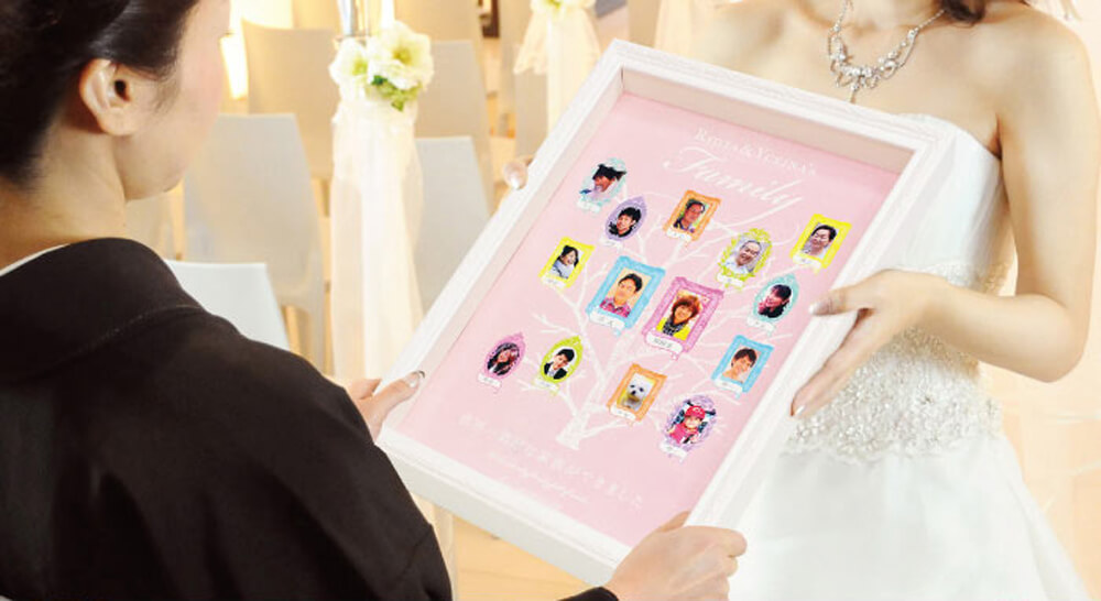 オリジナリティあふれる記念ギフトとして人気なのが、こちらファミリーツリーです。新郎新婦を中心に家系図のように枝が伸びるファミリーツリーは、両家がひとつの家族になったことを表します。両家の家族みんなの顔と名前を、ひと目で把握できる面白いアイテム。最大14枚まで写真を選ぶことができます。