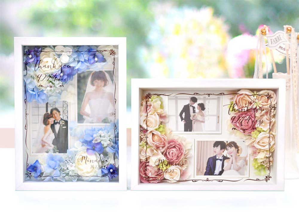 アーティフィシャルフラワーのアレンジがほどこされた華やかなフォトフレームです。縦、横、自由にレイアウトを決めることができるので新郎新婦の好みでアレンジが可能。ガラス面の透明フィルムには名前や日付、生まれてから結婚式までの日数が入ります。