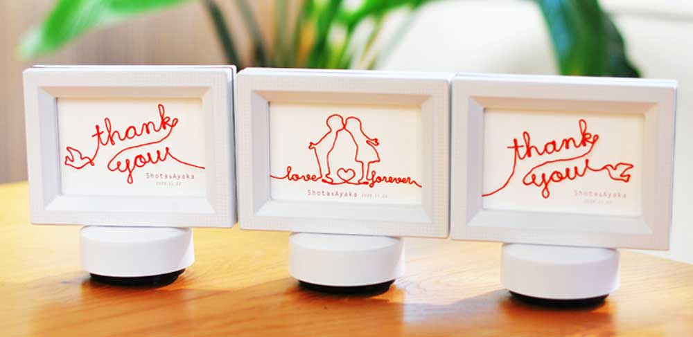 オルゴールになった三連フォトフレームは、統一感を大切にしながらオリジナリティも演出したい、というカップルにピッタリです。オルゴールの音楽は「糸」。それぞれにメッセージを記入できる台紙がついているので、新郎新婦の気持ちをしたためて贈ることができます。もちろん好きな写真を入れて贈ってもOKです。