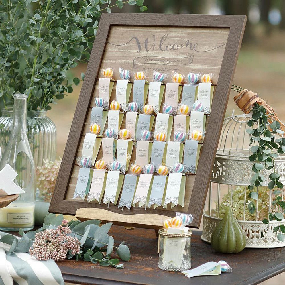 ウェルカムボードの準備がちょっぴり面倒に感じているカップルには、ボードタイプのプチギフトがおすすめです。「Welcome」の文字が刻印されたボードにはキュートにラッピングされたキャンディーたちが並んでいます♡ひとつひとつにタグが付いているので、メッセージカードとしても活用するのも面白いアイデアです。
