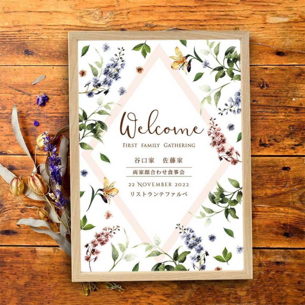 食事会の会場を素敵に彩ってくれるウェルカムボードもおすすめです。会場の装飾として活用できることはもちろん、記念撮影時の小物としても使える便利なアイテム。結婚式当日だけでなく、顔合わせ食事会でもファルベのアイテムは大活躍です!
