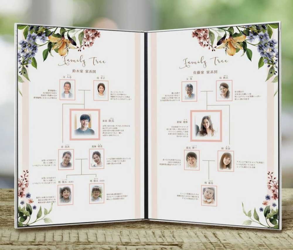 結婚式の前に行う顔合わせ食事会は、お互いの両親と初対面となるケースもあり、緊張してしまいがち。そんな張り詰めた空気を和らげてくれる素敵なアイテムもファルベで手に入れることができます。例えば、家族紹介を兼ねた「家系図/ファミリーツリーブック」なら楽しくお互いの家族のことを知ることが可能です♡顔合わせ食事会終了後に自宅に持ち帰れば、当日参加できなかった兄弟姉妹や祖父母も楽しんでもらえます。