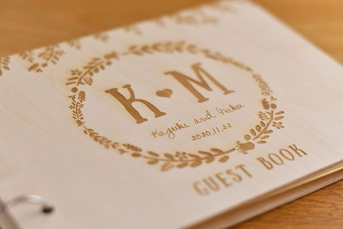 お店でたくさん販売されているシンプルなゲストブックにちょっと飽き飽き。そんなプレ花嫁さんにおすすめなのが、木にレーザー彫刻して作っている木製のゲストブック。表紙にはお二人のお名前と記念日をお入れいたします。そう!1つずつご注文をいただいてからお名前レイアウトし、彫刻しているカスタマイズ型ゲストブックなのです。