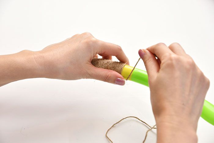 フラフープに巻く麻ひもは太いタイプならもっとスピードアップ。毛糸なんかもいいかもです♡