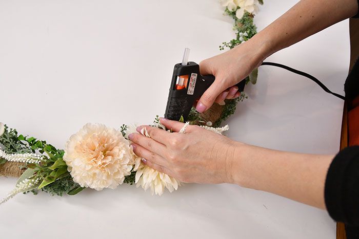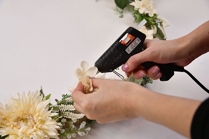 ワイヤー付だから巻き込むだけあっという間に出来上がり♡そしてあとはお花をグルーガンでくっつけていきます。