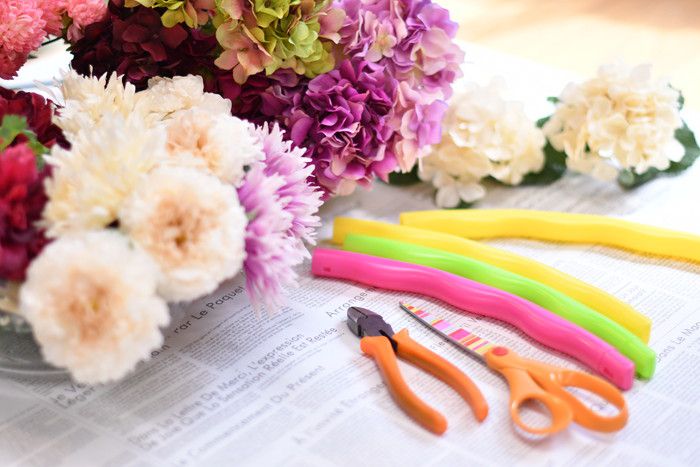 あとは、お好みのアレンジ用葉や造花など。お道具はくっつけるためのグルーガン。