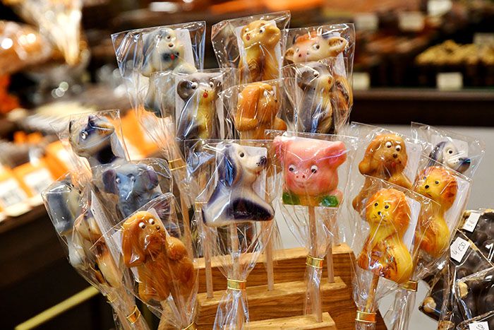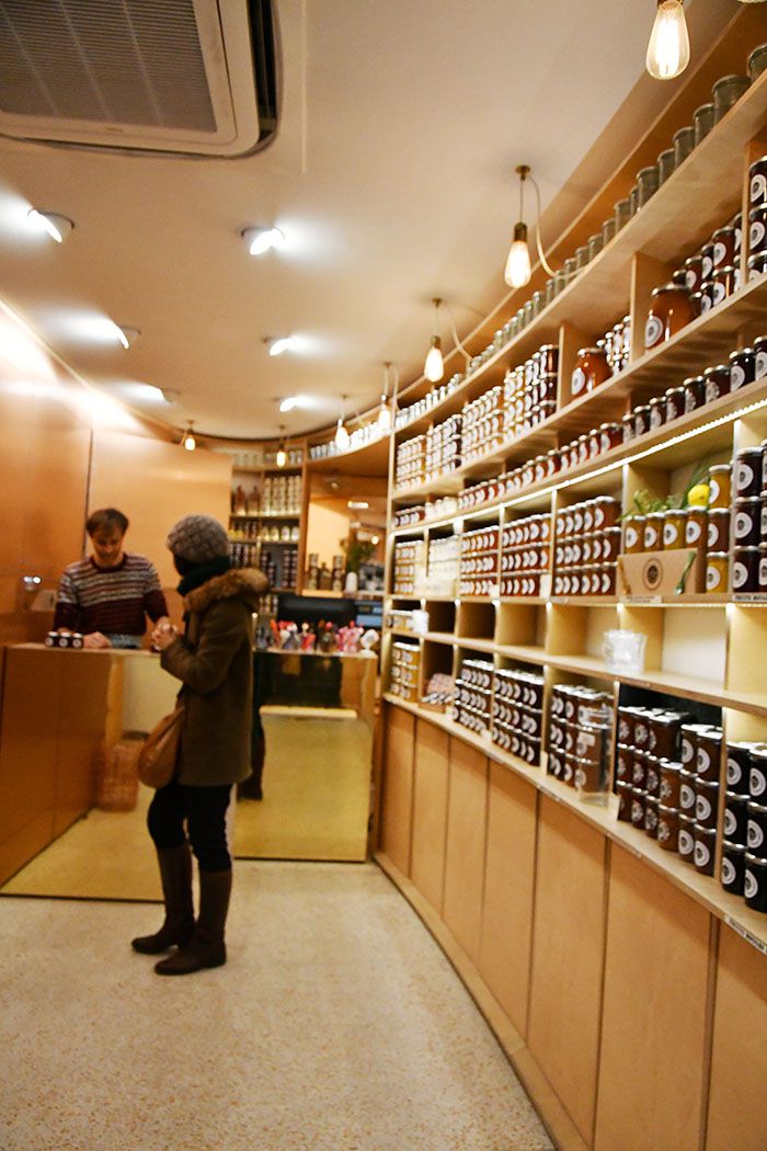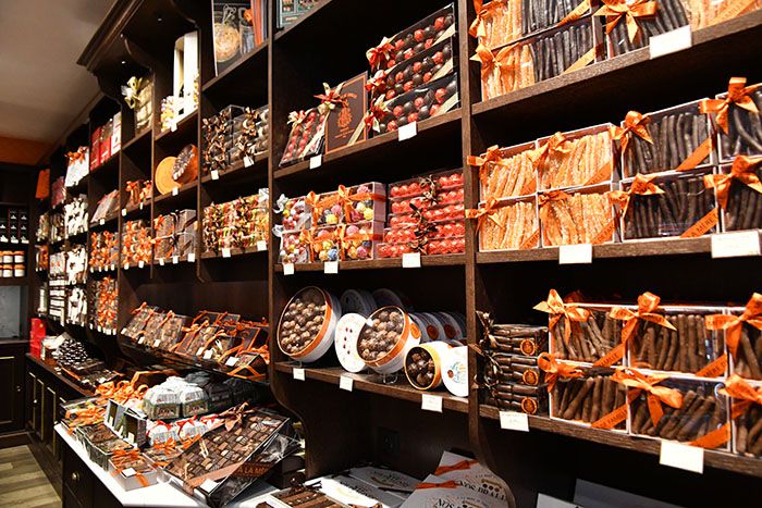 グリーンの外観店内に入るとブラウン×オレンジの色合いで統一されていてとっても素敵!チョコレートにフルーツの砂糖漬け、マジパンで作ったカワイイお菓子など映画のワンシーンに出てきそうなものばかり。