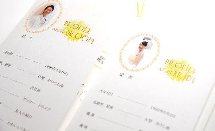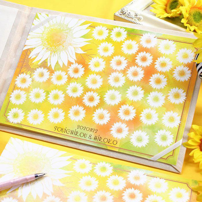 ひまわりが大胆にあしらわれたゲストブックやイラストが印刷されたゲストブック。ゲストが最初に向かう受付が華やかになること間違いなし♡