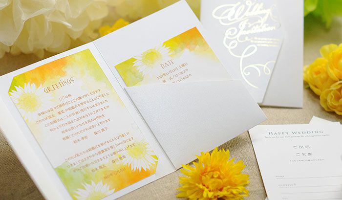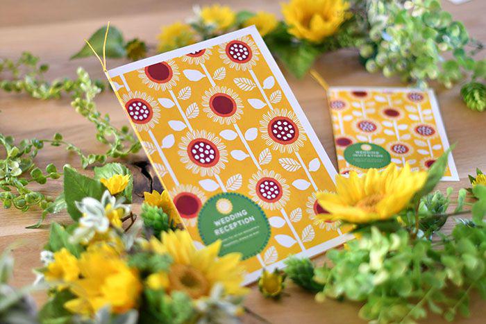 こちらひまわりがデザインされた招待状・席次表・席札。ひまわり柄もタッチによってイメージはぐんと変わりますよね。