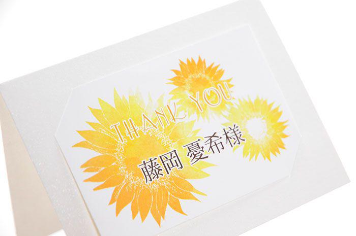 プチギフトにもひまわりを取り入れて♡元気いっぱいのひまわりギフトは満面の笑みの二人にぴったり。お開きまで笑顔たっぷりのおもてなしを。