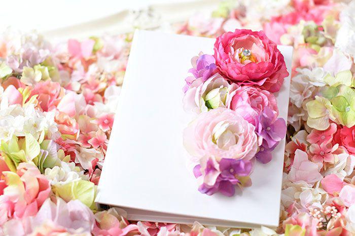 華やかなカバーで見た目もGOODな、このフォトアルバム。カバーを開けばメッセージやお写真入りの感謝状付き◎花嫁からの感謝の手紙をプラスできるので、アルバムの特別感もかなりUP!