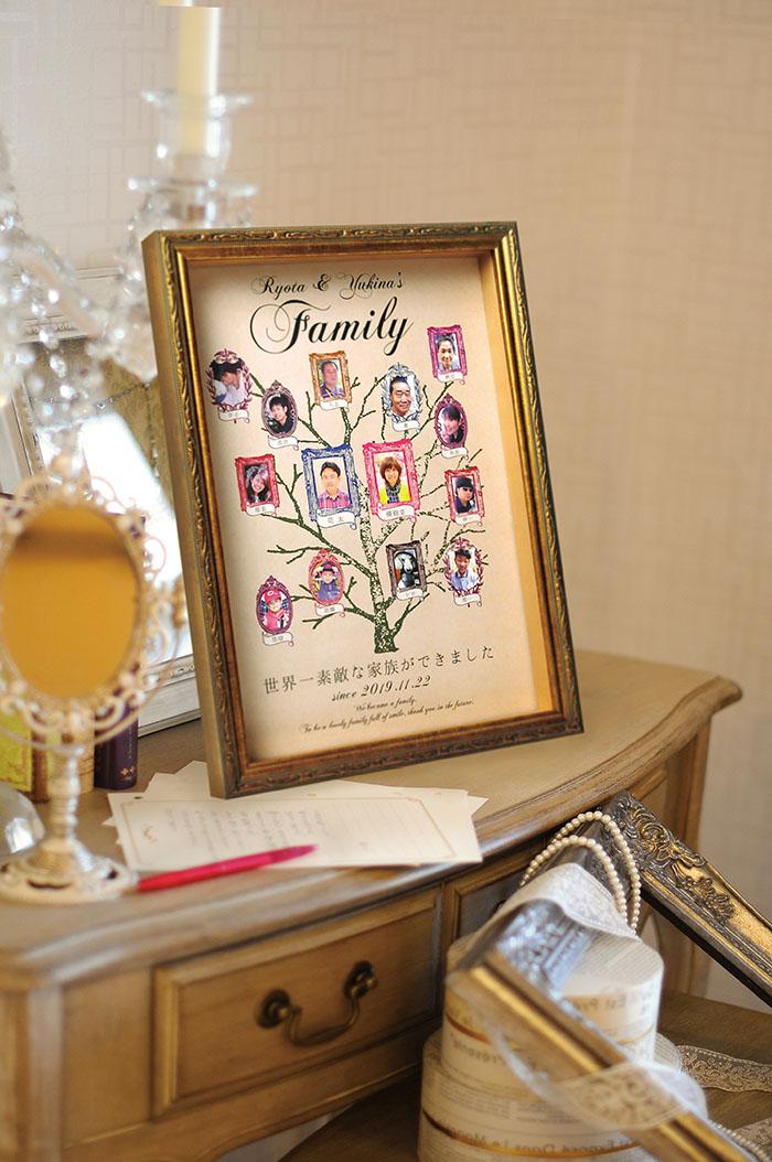 それぞれの家族の歴史と両家がめぐりあった奇跡を一本の木で表現した、家系図仕立ての記念品「ファミリーツリー」。