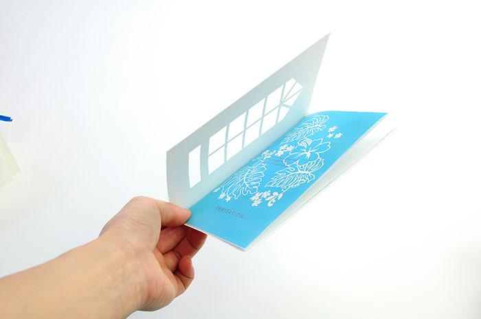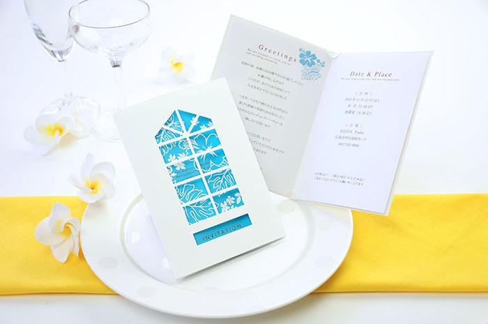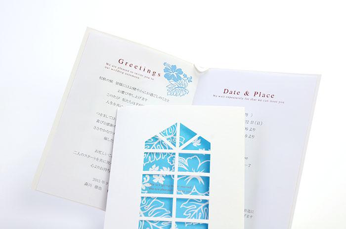 窓からのぞくブルーのペーパーとハイビスカスのイラストの組み合わせが爽やか!見ているだけで元気&HAPPYな気持ちになれるハイビスカスは、リゾートウェディングに取り入れたいデザインのひとつ。