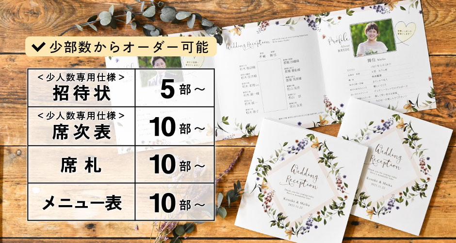 こちらは5部から注文OKで少部数というだけでなく、少人数婚ならではの内容で作れて安心な印刷付きのオーダー招待状。