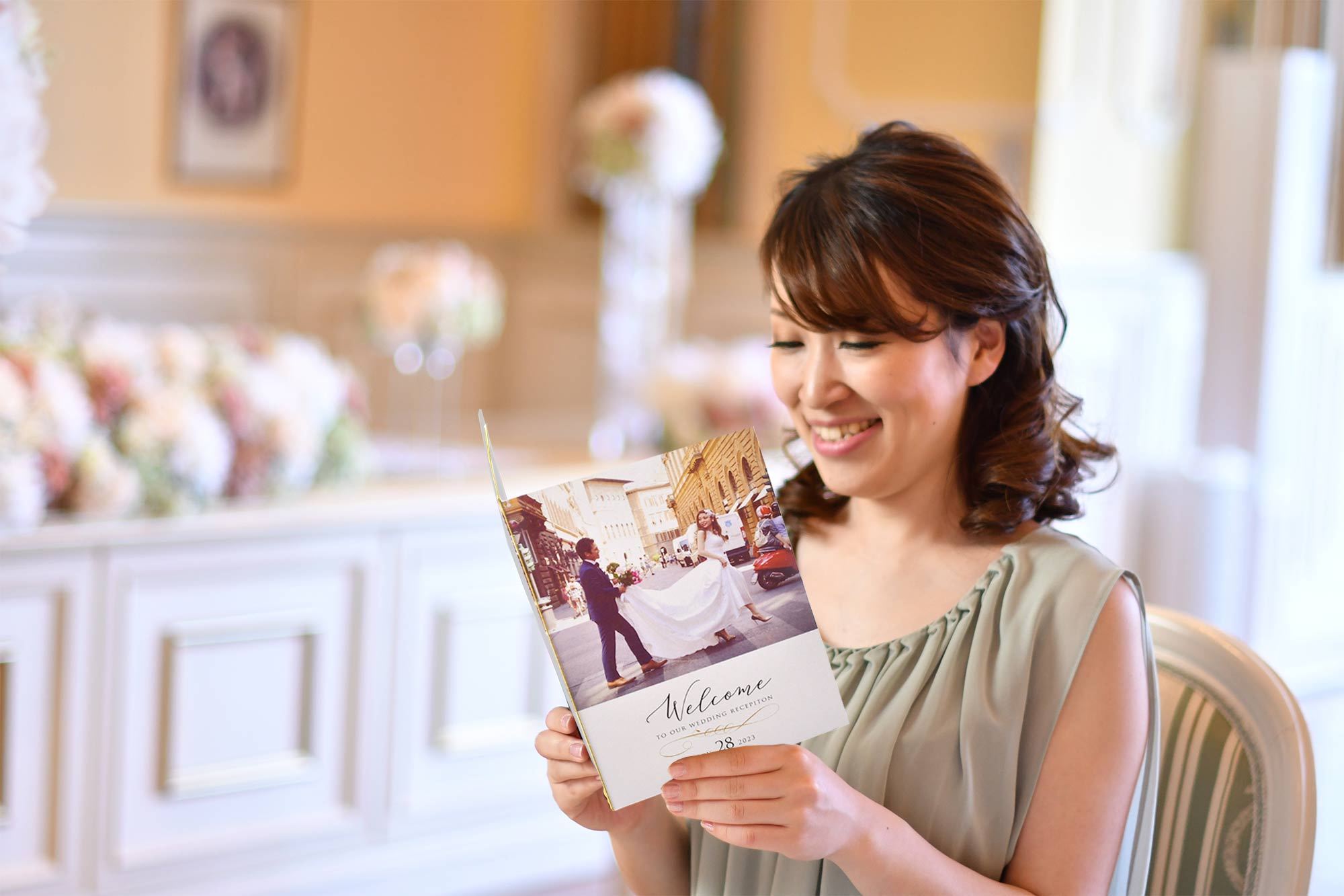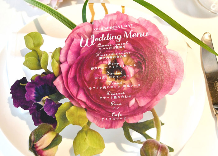 少人数での結婚式の場合、席次表はなくてもOK。ただ、待ち時間を楽しく過ごしていただくために「読み物」という感覚でメニュー表やプロフィール表を準備される方も多いです。