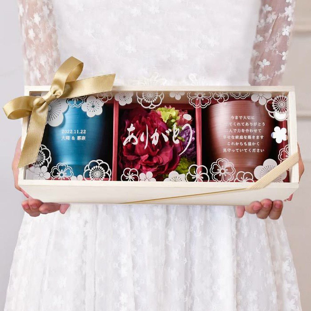 内祝いに!日常使いできるペアのフリーカップとアーティフィシャルフラワーのアレンジセット
