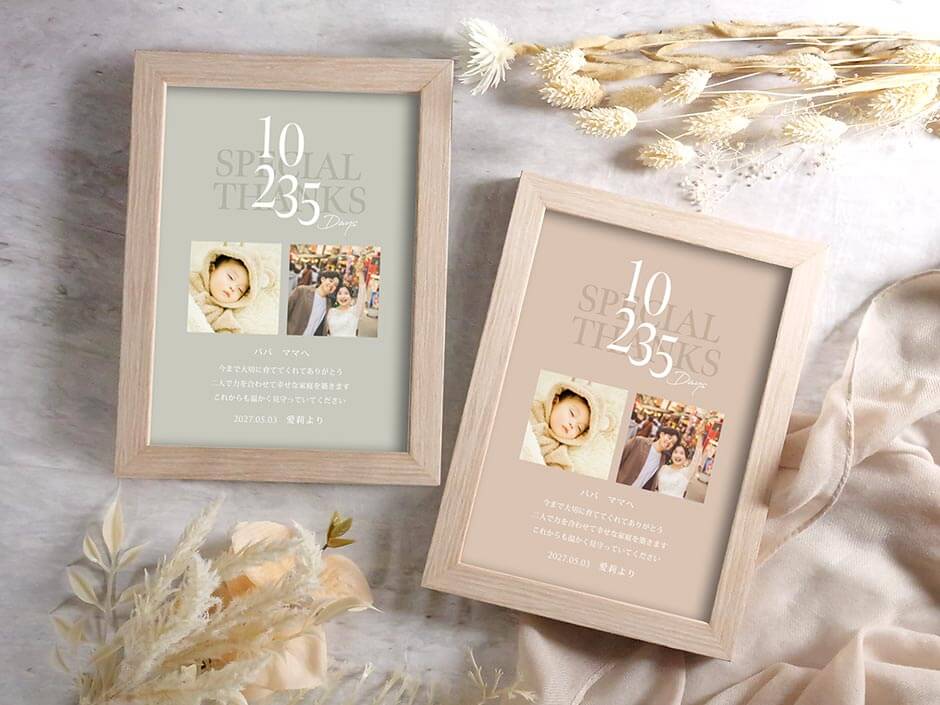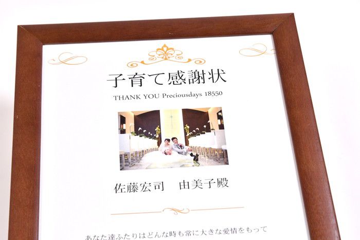 まるで豪華な賞状みたいな子育て卒業証書。生まれた時の写真と今の写真を二枚入れることができます。「素敵な名前をつけてくれてありがとう」とお名前とカウント日数を大きくレイアウト。生まれた日からの感謝をたっぷりつめこめます。