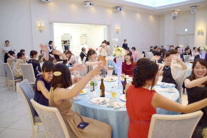 新郎新婦がそれぞれマイクを持って歩き、ゲストに歌ってもらいながら歩くことによって、新郎新婦の二人もゲスト全員と、ひとりひとり目を合わせてお礼を言えたり、また参加してもらったゲストも、会場の一体感に包まれることによって、式に参加できたことへの喜び、そして結婚式の素晴らしさを噛み締めれる瞬間になりますね♪