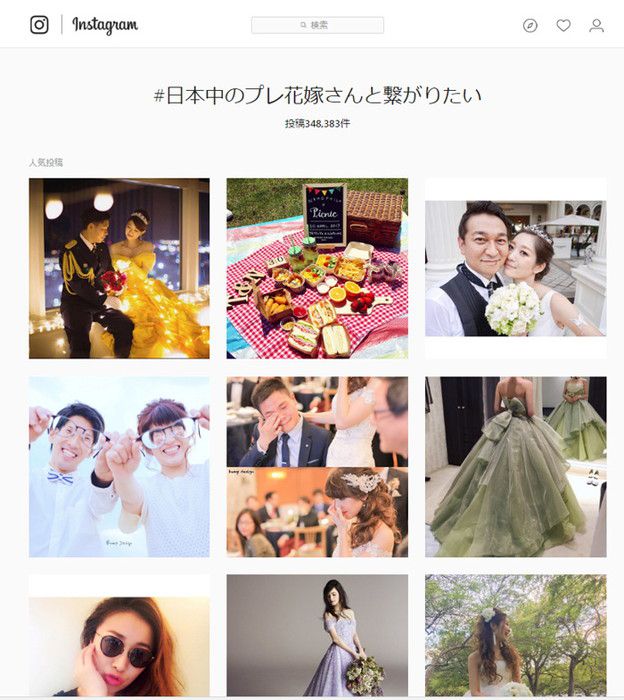 ということは、日本全国の結婚式前のプレ花嫁さんとつながることができるんです♡♡!今、オススメのハッシュタグは、「#日本中のプレ花嫁さんと繋がりたい」というものです。現在instgramでは、この#の投稿が343873件もあります。