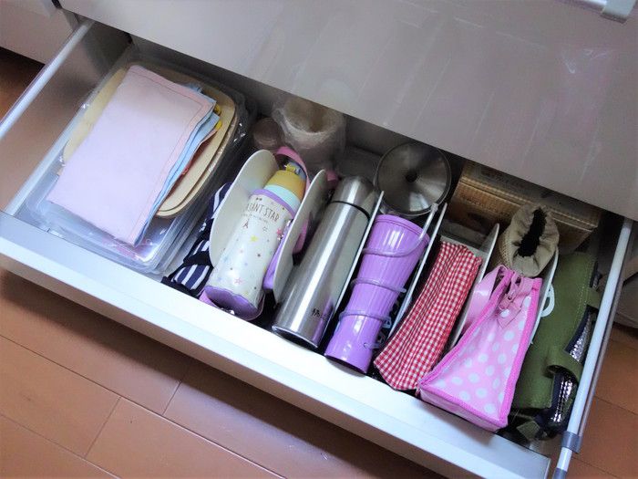 わが家のシンデレラフィットを探してみました。シンク下の幅広い引き出しに水筒を入れていたのですが、開け閉めするたびにごろごろと動いているのが分かり気になっていました。一つ取り出すと隣の水筒もずずっとずれてきて、ちょっとしたストレスに。そこで3またのブックエンドを活用。1またごとに水筒を入れておくと、水筒を取り出しても隣の水筒が動かないし、戻すときもスペースが空いたままで快適です。